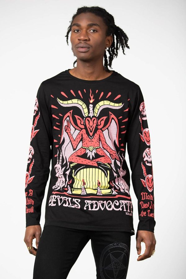 – Text reads “Make a deal with the devil” on sleeves and “Devils advocate” on the front of the top.