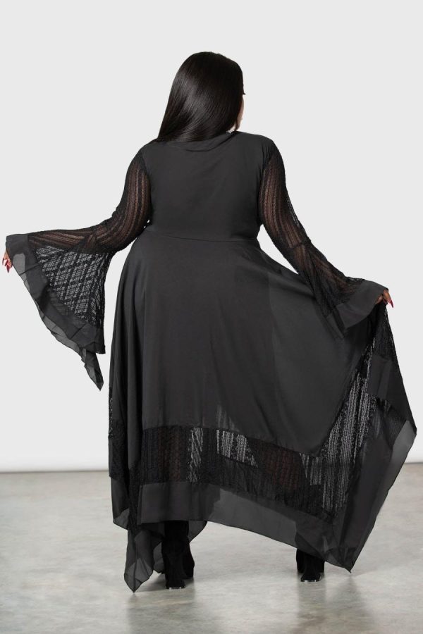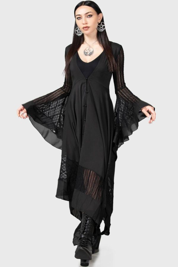 – Long waterfall sleeves.